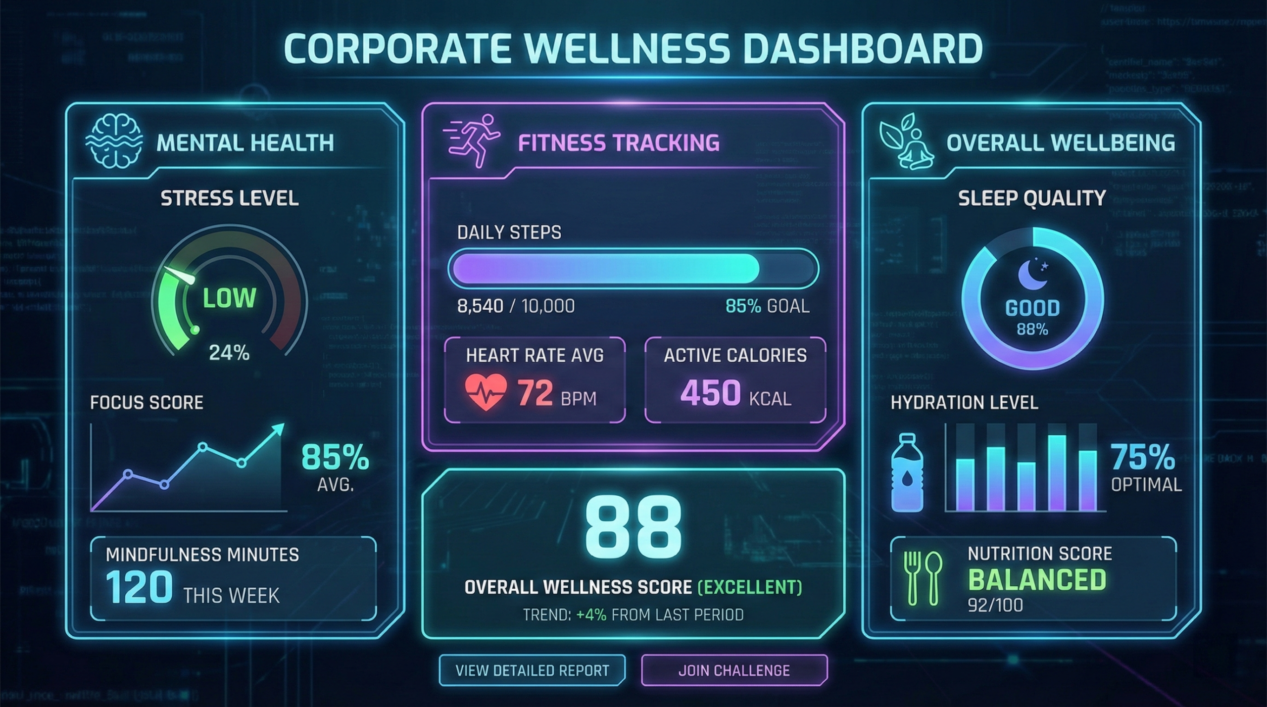 Corporate wellness programs typically include mental health resources, counseling access, fitness initiatives, nutrition guidance, financial wellbeing education, and wellbeing awareness campaigns. Digital wellness platforms make these programs accessible to remote and hybrid employees.