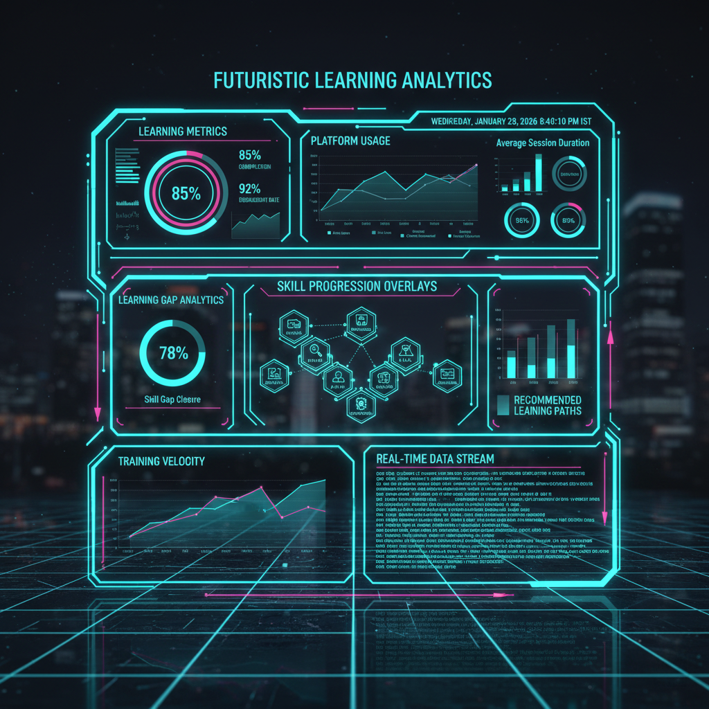 Training analytics draws data from LMS, LXP, content platforms, skills platforms, assessments, surveys, simulations, and workflow performance tools. Analytics may include usage, completion, certification, assessment scores, skill progression, time-to-productivity, and behavioral change metrics. Advanced models incorporate predictive analytics, machine learning, and benchmarking to forecast talent readiness and workforce capability needs.